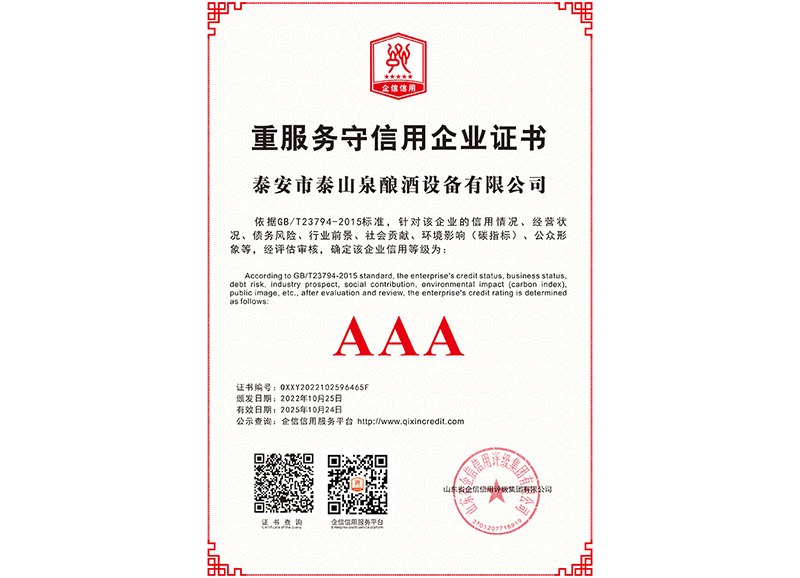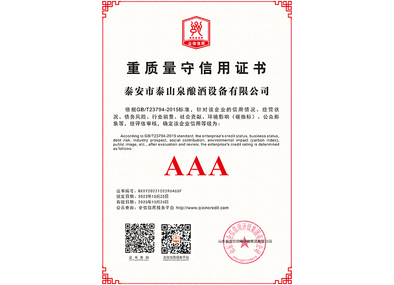 泰安市泰山泉釀酒設(shè)備有限公司,是一家專業(yè)從事釀酒設(shè)備機(jī)械化研發(fā)并集技術(shù)咨詢,工程設(shè)計,制造安裝,人員培訓(xùn)及售后服務(wù)為一體的綜合性企業(yè),本公司主要產(chǎn)品為:大曲清香、小曲清香、大曲醬香、大曲濃香等香型白酒機(jī)械化設(shè)備。 本公司與中國科學(xué)院自動化研究所簽訂技術(shù)服務(wù)合同,引進(jìn)先進(jìn)技術(shù),研究生產(chǎn)全自動化機(jī)械釀酒設(shè)備,由中國科學(xué)自動化研究所的技術(shù)支持,打造最先進(jìn)的生產(chǎn)釀酒設(shè)備,公司有信心打造全國最先進(jìn)白酒...